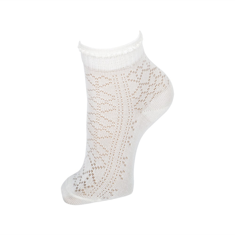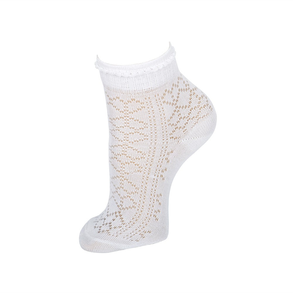 Calcetín con alta composición de hilo de Escocia, altamente transpirable. Con un elegante calado de rombos y puño de fantasía, que lo hace perfecto para ocasiones especiales como ceremonias o eventos. Su altura es por los tobillos, con un puño que no aprieta. Combina muy bien con nuestros conjuntos interiores de niños.
