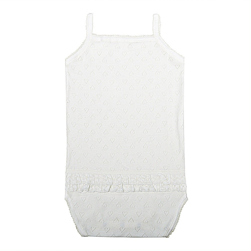 Body de tirantes finos hecho de 100% algodón peinado. Con una puntilla de adorno en la parte del culito que queda muy bonita debajo de vestidos. La apertura es por la parte de abajo mediante tres corchetes súper resistentes. Un body que resiste infinitos lavados. Tiene además un calado en forma de corazones que dota de mayor transpiración para los días más calurosos.