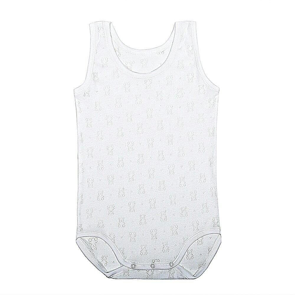 Body de tirantes anchos hecho de 100% algodón peinado. La apertura es por la parte de abajo mediante tres corchetes súper resistentes. Un body que resiste infinitos lavados. Tiene un calado en forma de ositos que, además de ser muy bonito, ayuda a una mayor transpiración para los días más calurosos.