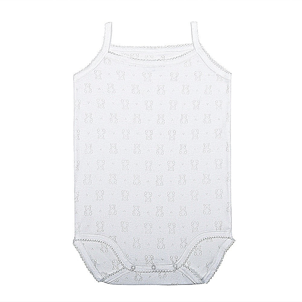 Body de tirantes finos hecho de 100% algodón peinado. El tejido es fresco y transpirable. La apertura es por la parte de abajo mediante tres corchetes súper resistentes. Un body que resiste infinitos lavados. Tiene además un calado en forma de ositos que dota de mayor transpiración en los días más calurosos.