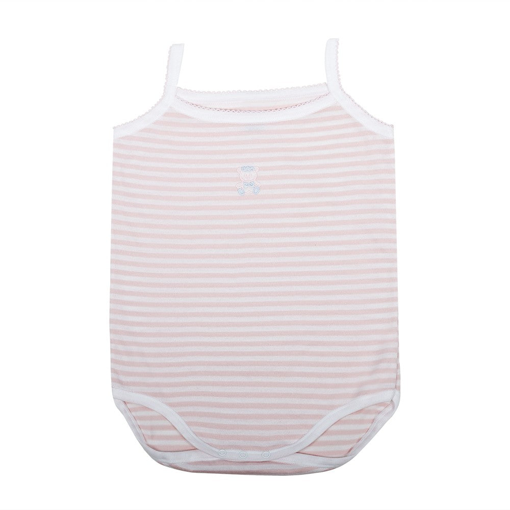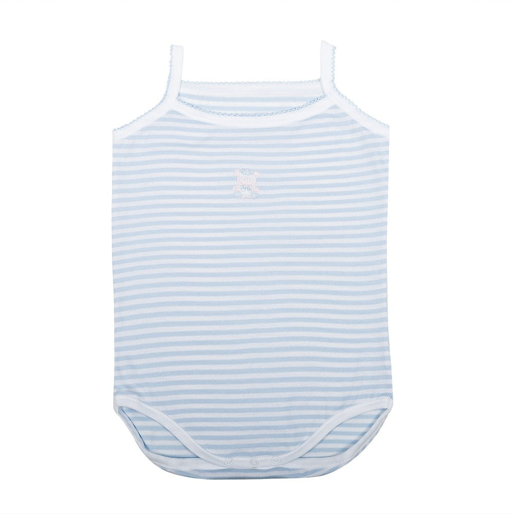 Body de tirantes finos hecho de 100% algodón peinado. Un tejido especialmente fino con extra suavidad, fresco y transpirable. Tiene un bordado de osito en la parte del pecho y dibujo de mil rayas que resiste infinitos lavados. La apertura es por la parte de abajo mediante tres corchetes súper resistentes.