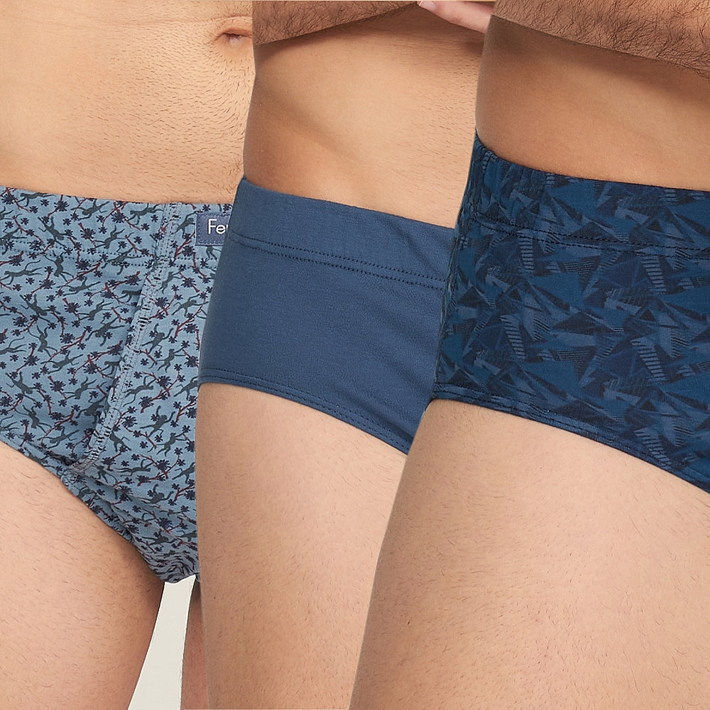 Pack de tres slips abiertos en tejido de 100% algodón. Dos slips estampados en forma de pajaritas y flores, y uno liso azul.
