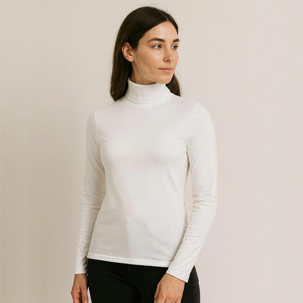 Elegante y versátil camiseta de cuello alto confeccionada en España con algodón 100% de alta calidad. Suave al tacto y perfecta para mantener la comodidad sin sacrificar el estilo. Ideal para cualquier ocasión, ya sea casual o sofisticada.