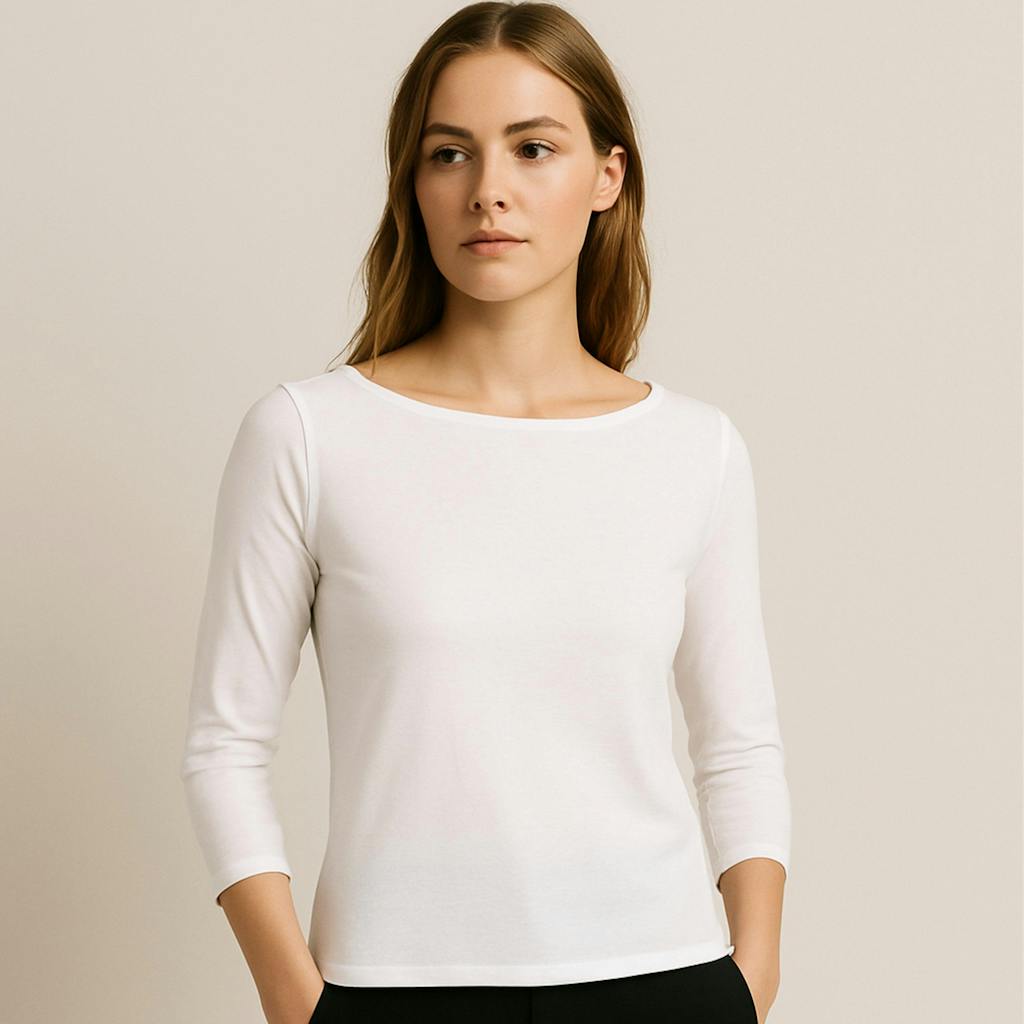 Camiseta de manga por la altura de los antebrazos y cuello barca, con tejido de todo tiempo de 100% algodón peinado. Con un tejido especial en el cuello para que no se desboque con el uso. Material totalmente natural y transpirable, ideal para alergias o pieles atópicas. No tiene costuras, por lo que no roza la piel por ningún sitio. El tejido es anti-pilling, que no hace bolas. Los colores no se destiñen con los lavados.