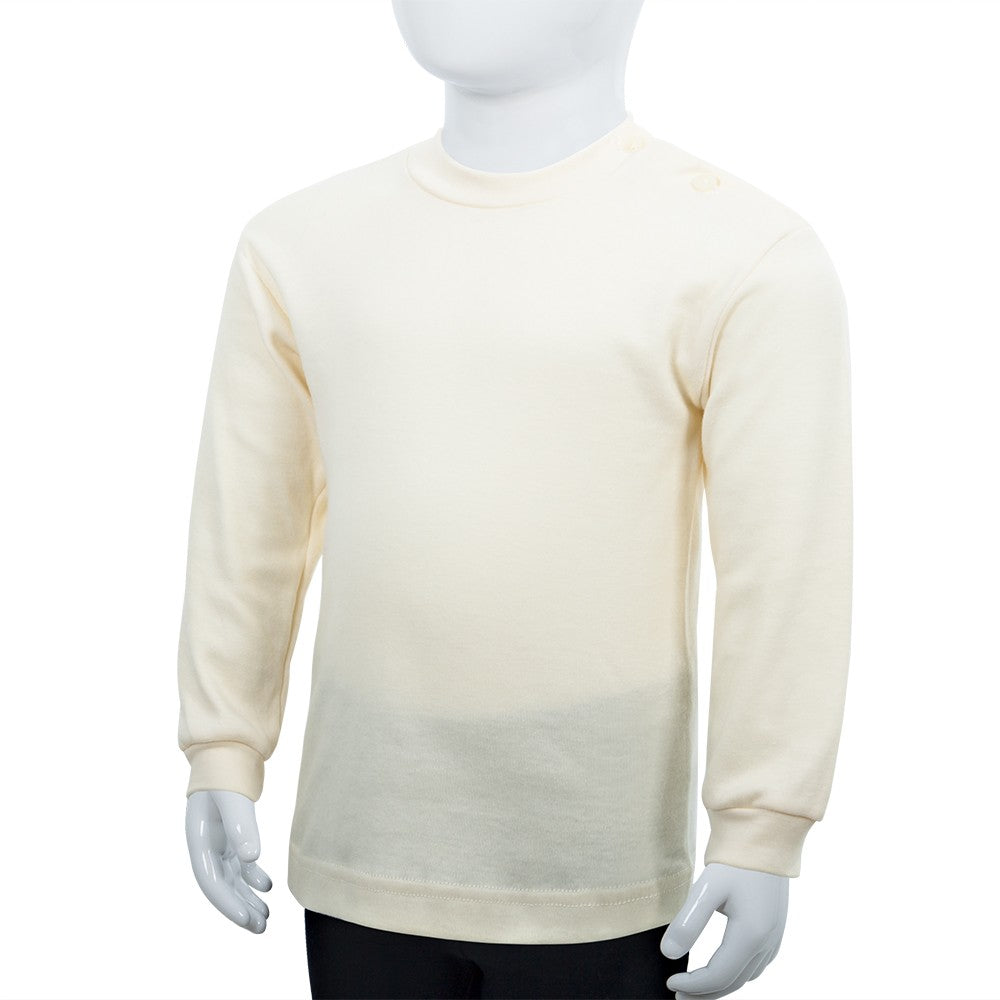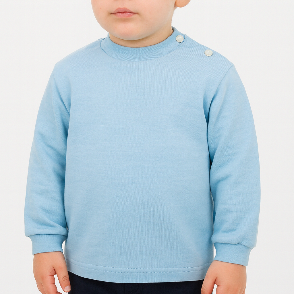 Camiseta de manga larga con tejido de 100% algodón peinado. Tiene una apertura en el lateral del cuello mediante botones, que facilita la entrada y salida de la cabeza del bebé. Con un tejido especial en el cuello para que no se desboque con el uso. Material totalmente natural para cuidar la piel de los más pequeños. No tiene costuras, por lo que no roza la piel por ningún sitio. El tejido es anti-pilling, que no hace bolas. Los colores no se destiñen con los lavados.