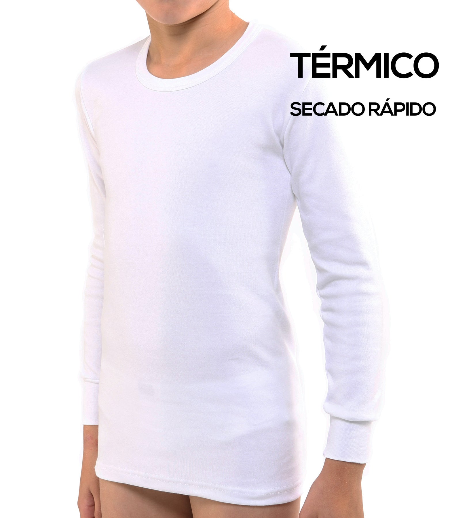Camiseta interior de niño de manga larga y cuello redondo. De algodón mix, fácil cuidado, secado rápido y sin plancha.