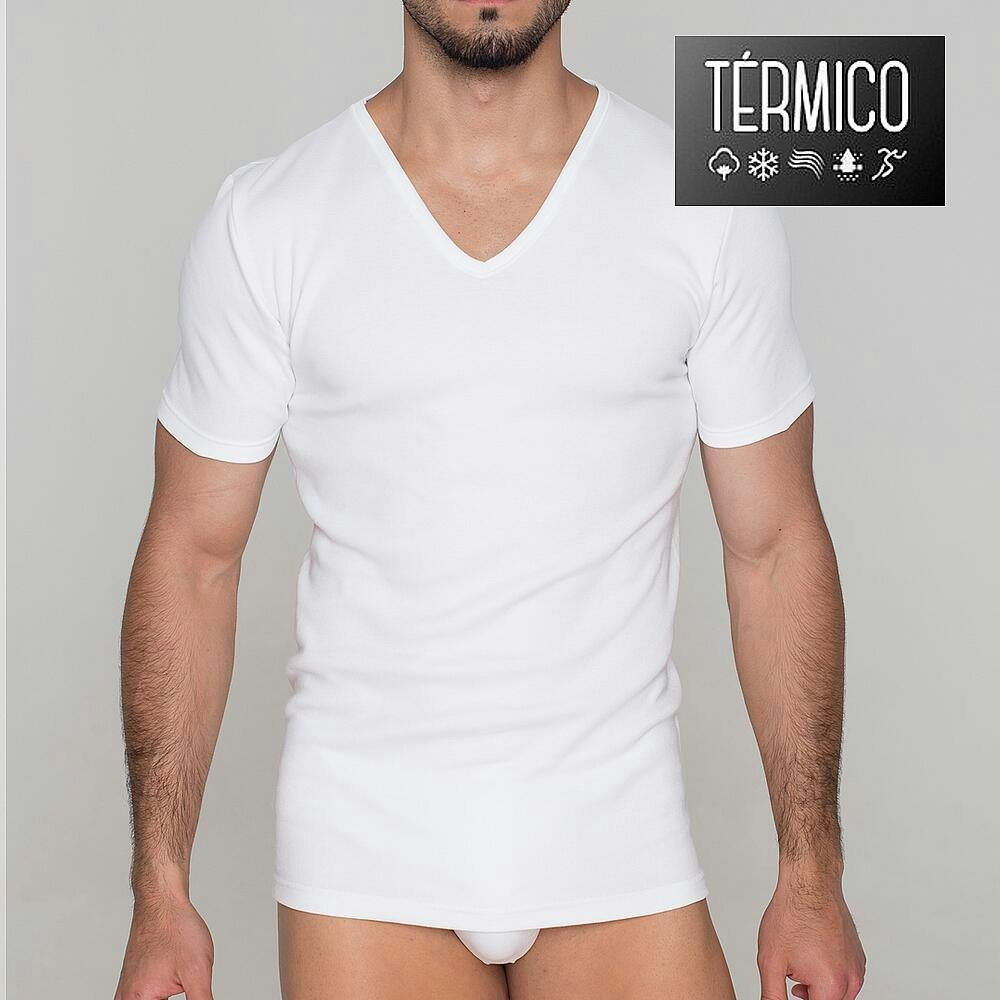 Camiseta interior de manga corta y cuello pico con tejido térmico afelpado de invierno. No se ve debajo de prendas exteriores. Gracias a su composición de 100% algodón peinado, totalmente natural y transpirable, calienta sin retener la humedad, y se aconseja para las personas con problemas de alergia o piel atópica. No tiene costuras, por lo que no roza la piel por ningún sitio y las terminaciones son todas extra-planas y resistentes. Además el cuello está hecho de un tejido especial, que no se desboca con el uso. Tejido anti-pilling, que no hace bolas. Calidad premium.