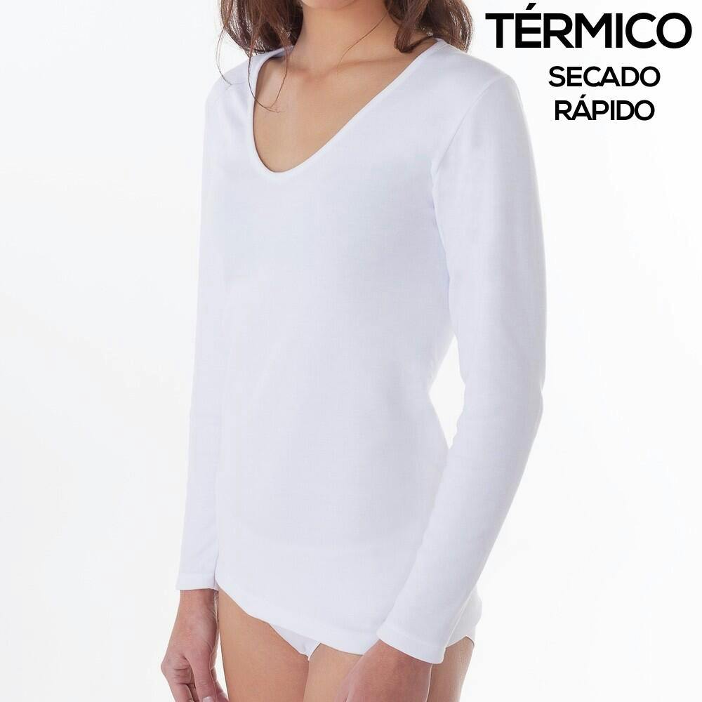 Camiseta interior de mujer de manga larga y cuello pico. De algodón mix, fácil cuidado, secado rápido y sin plancha.