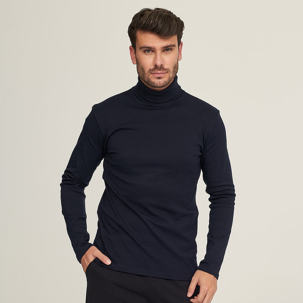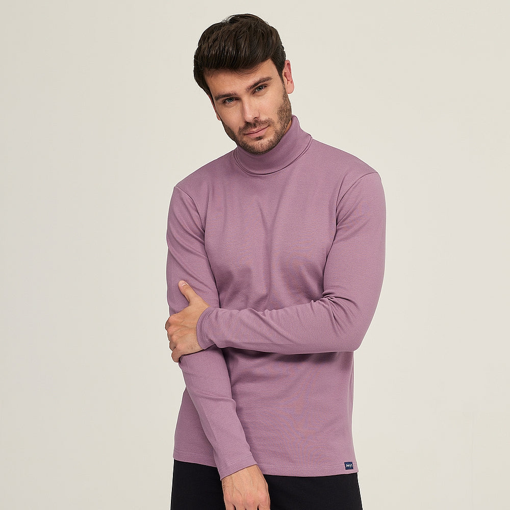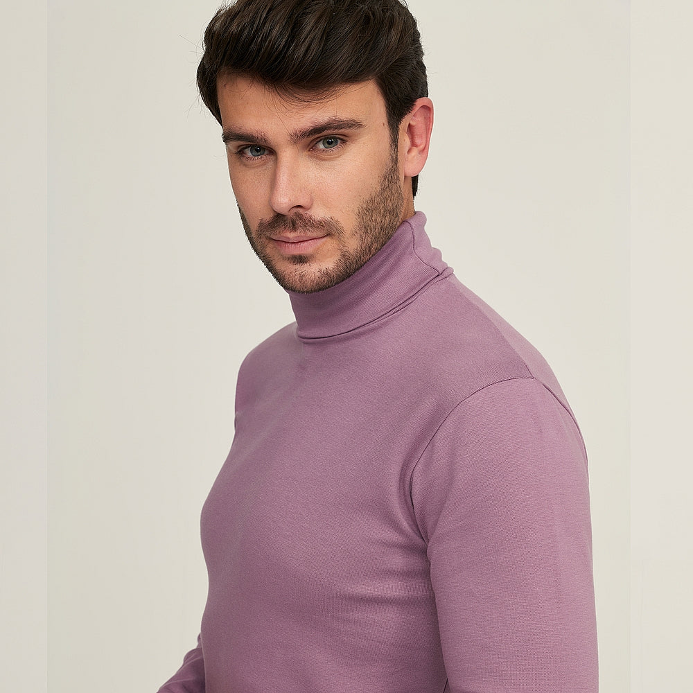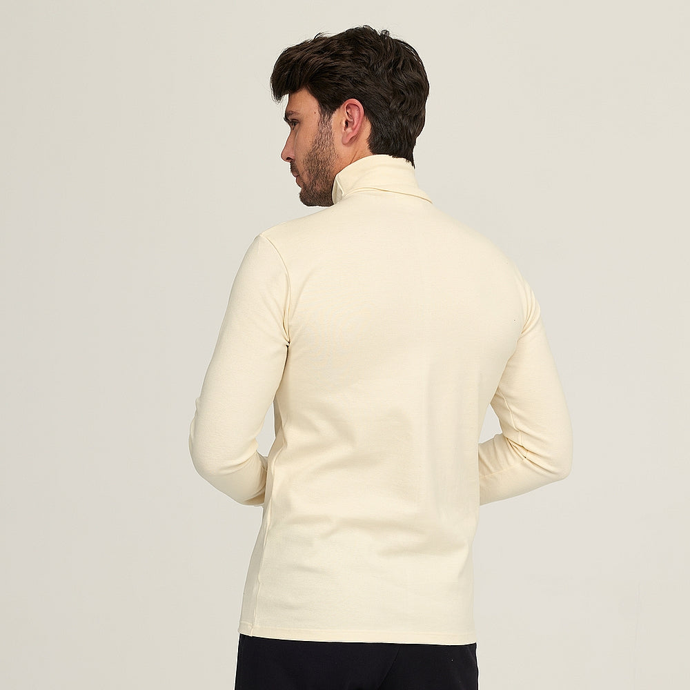Camiseta con cuello alto y de alta composición en algodón peinado. Gracias a su pequeño porcentaje en elastano y a la forma del tejido, queda algo ceñida al cuerpo y no se deforma con el uso. Queda ideal tanto exteriormente como debajo de alguna prenda, siempre abrigando el cuello. No tiene costuras. El tejido es anti-pilling, no hace bolas, y los colores resisten incontables lavados.
