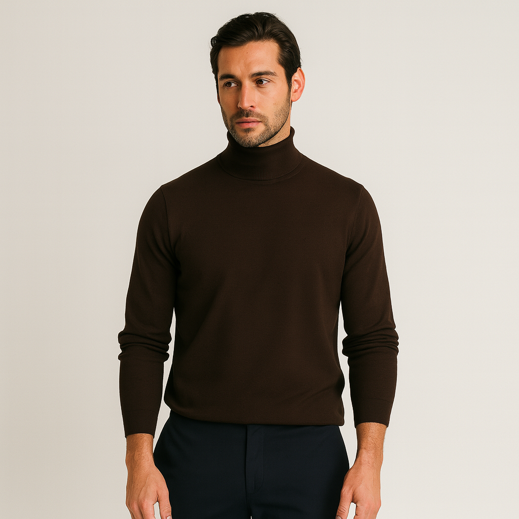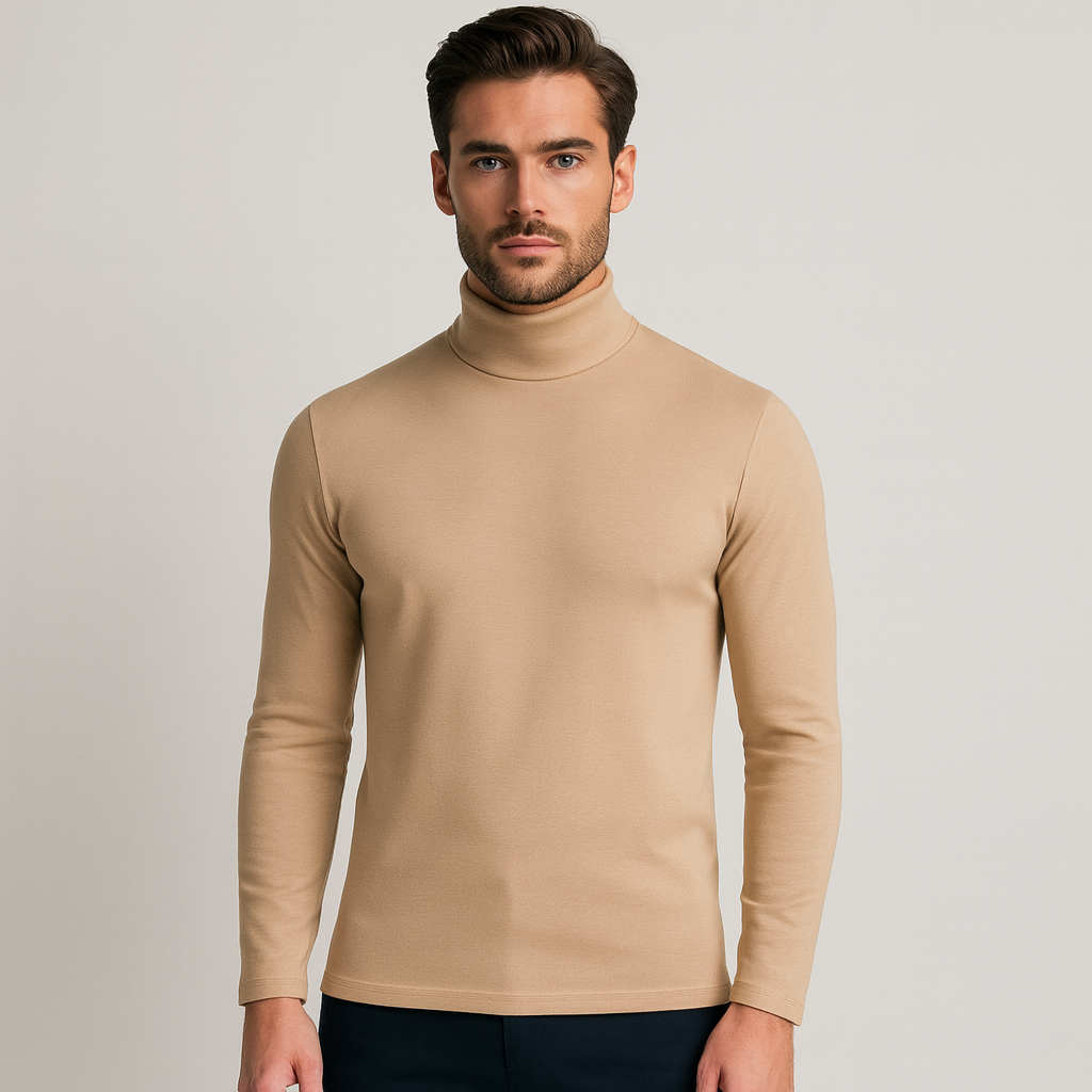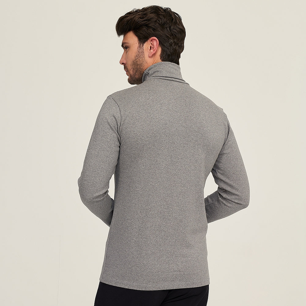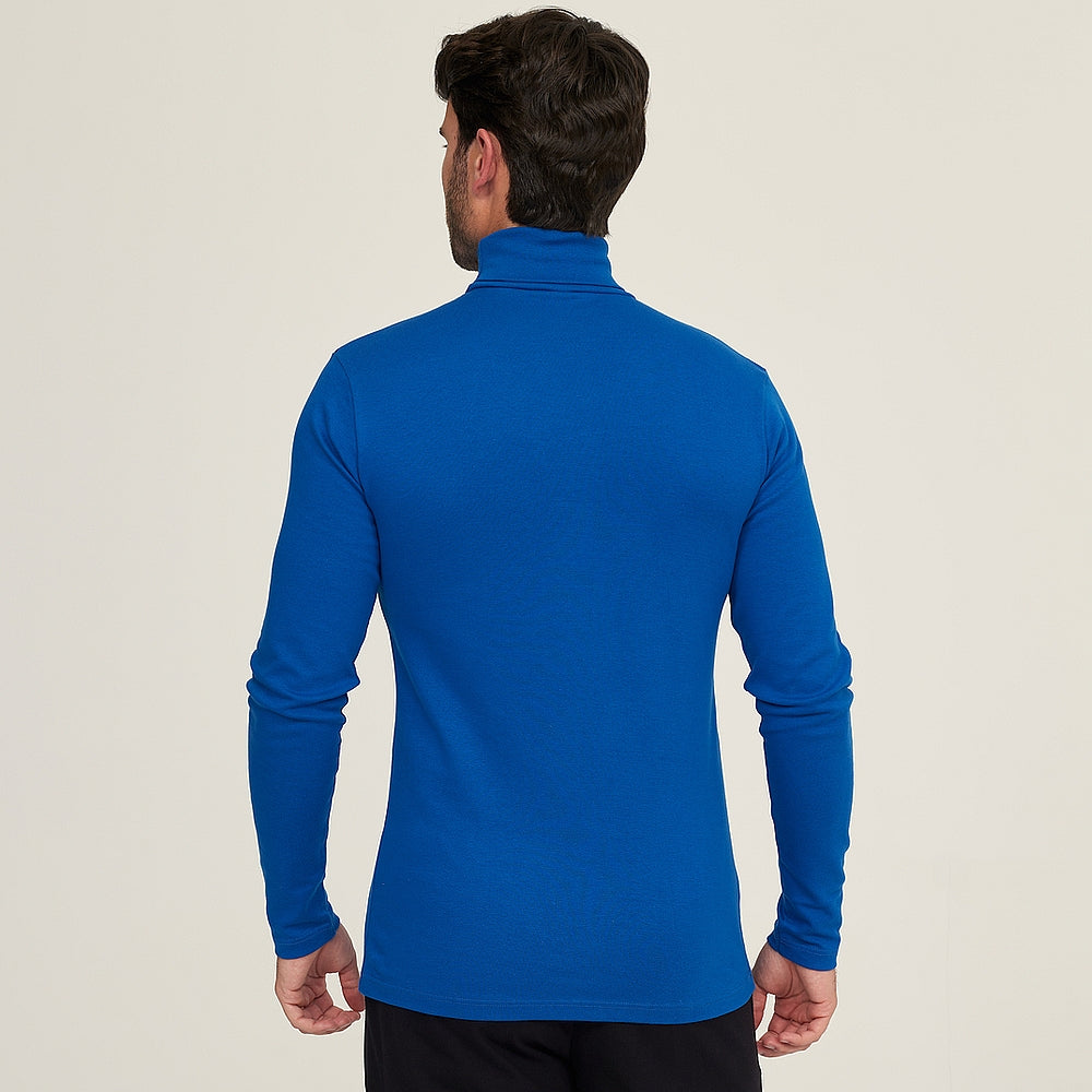 Camiseta con cuello alto y de alta composición en algodón peinado. Gracias a su pequeño porcentaje en elastano y a la forma del tejido, queda algo ceñida al cuerpo y no se deforma con el uso. Queda ideal tanto exteriormente como debajo de alguna prenda, siempre abrigando el cuello. No tiene costuras. El tejido es anti-pilling, no hace bolas, y los colores resisten incontables lavados.