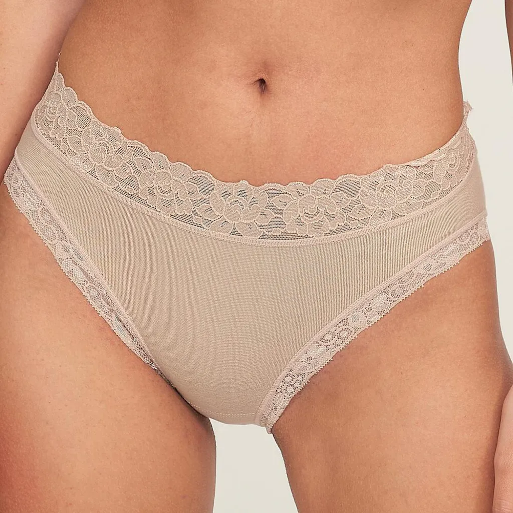 Braguita de talle medio sin costuras con alto porcentaje de algodón peinado, totalmente transpirable. Puntilla de adorno en la cintura y piernas que no pica y no aprieta. Tejido de rizo en la zona íntima que extrae la humedad para que siempre estés seca. No hace bolas y es resistente a los lavados y uso.