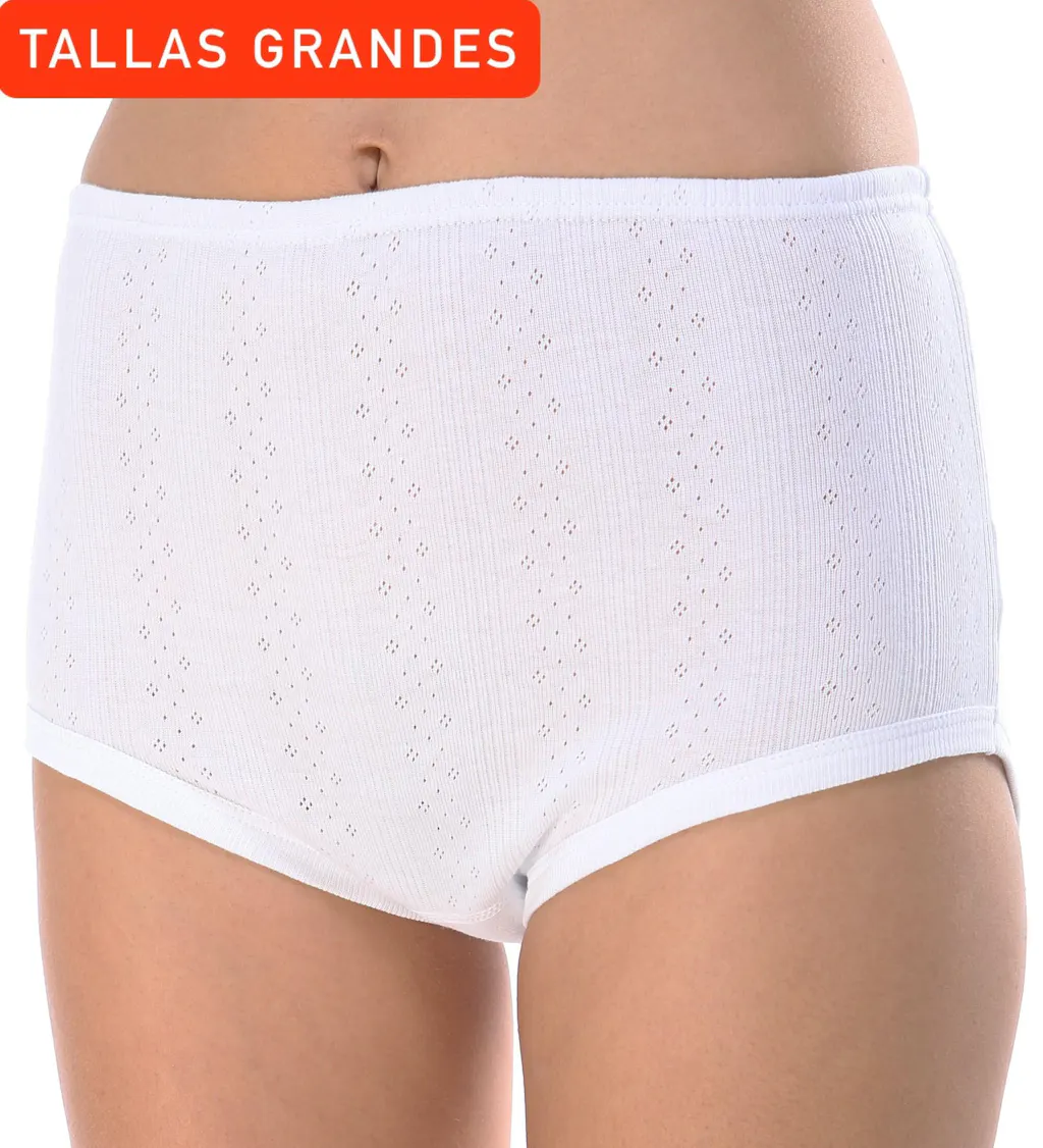 Braga clásica de 100% algodón peinado, referente en nuestra marca. Con un patrón especialmente diseñado para las mujeres de avanzada edad, de tiro alto y con la cintura y las perneras adaptables. Debido al rizo en el pedazo de la zona íntima, de tacto agradable y de máxima absorción, te sentirás limpia y seca durante mucho tiempo. Una prenda que resiste mucho uso y lavados, y que gracias a su material 100% natural y dibujo calado, facilita la transpiración y evita la retención de humedad. El tejido es anti-pilling, no hace bolas. Disponible también en tallas grandes.