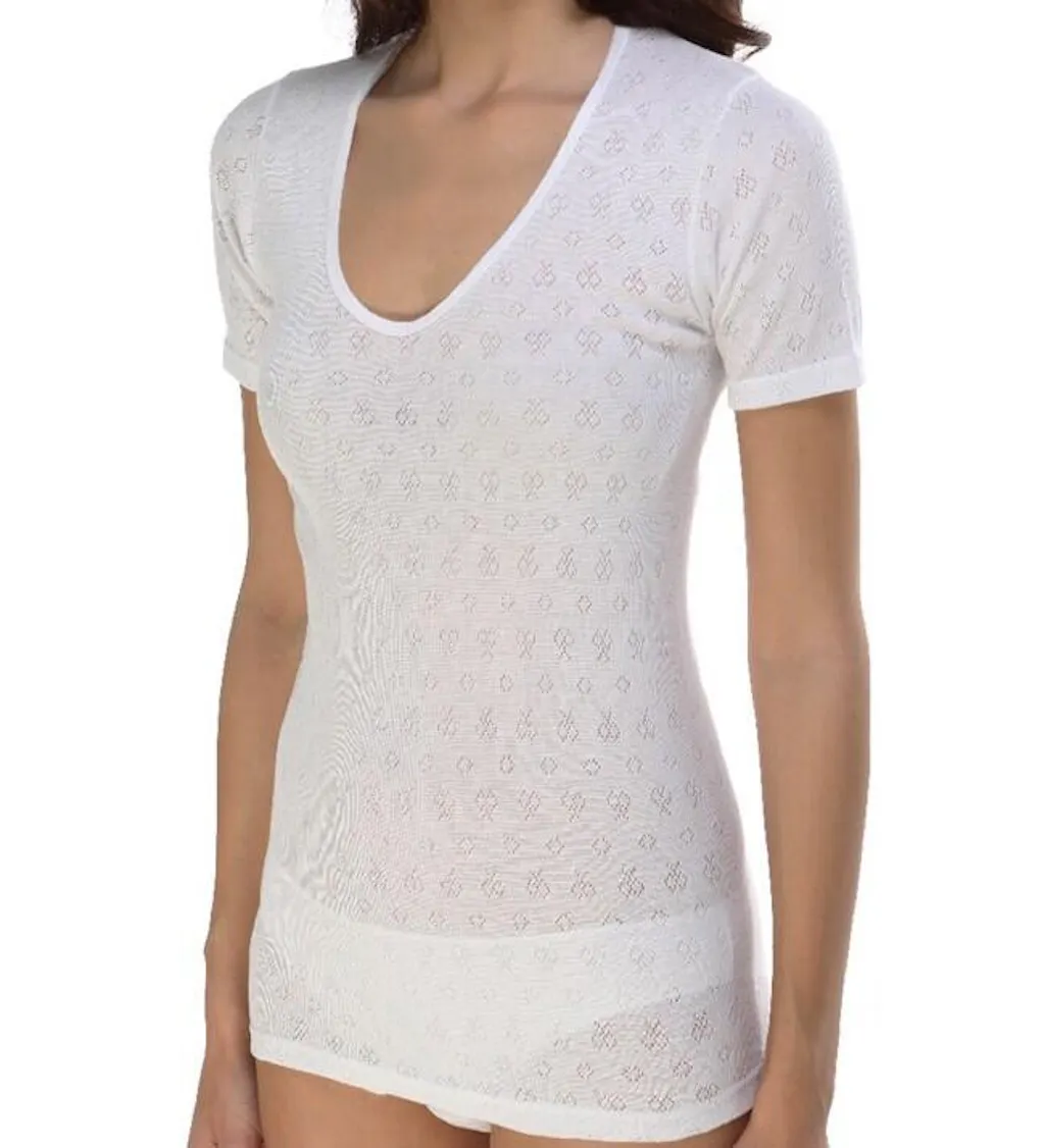 Camiseta de manga corta de 100% hilo de Escocia. Con un material totalmente natural, y que junto con el dibujo calado, facilita la transpiración y evita la retención de humedad. Los ribetes son también de hilo de Escocia, quedan muy elegantes y no importa que se vean debajo de una prenda exterior. El tejido es anti-pilling, no hace bolas. Combina con nuestras braguitas 5627 y 5628 Calidad premium.