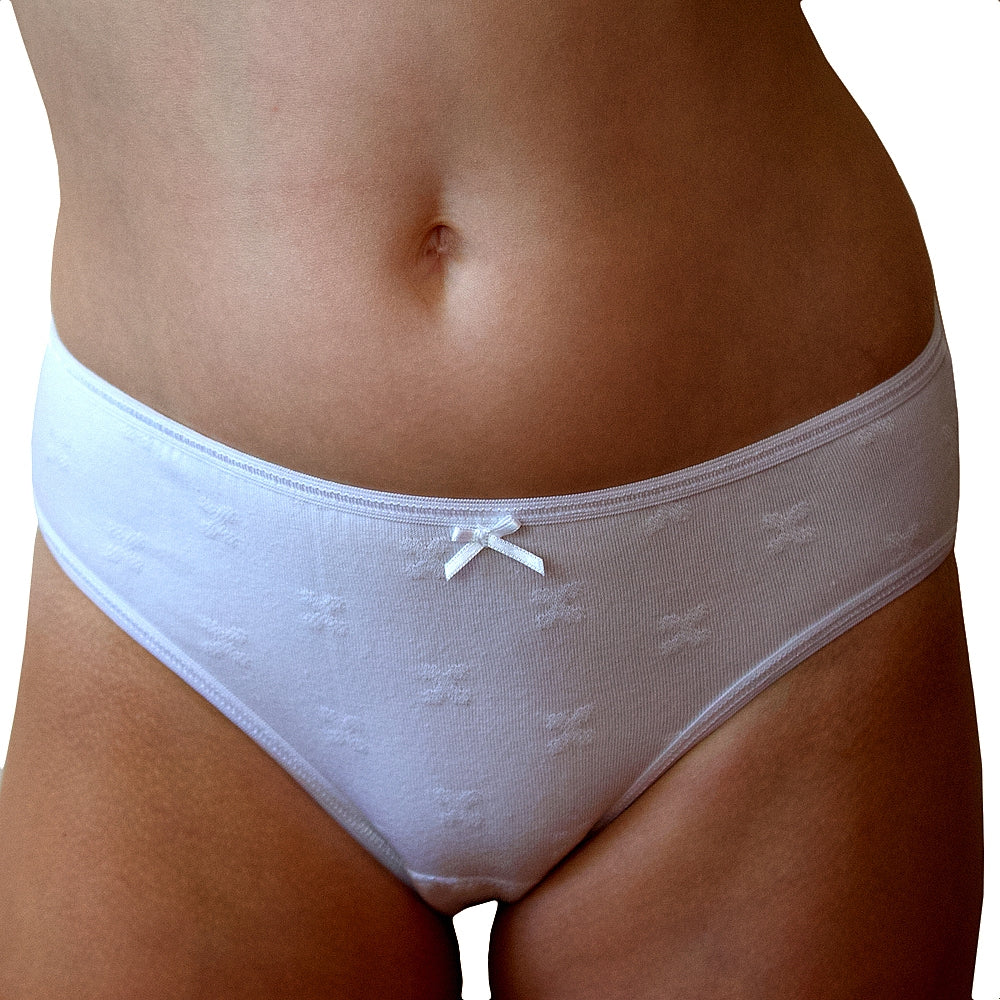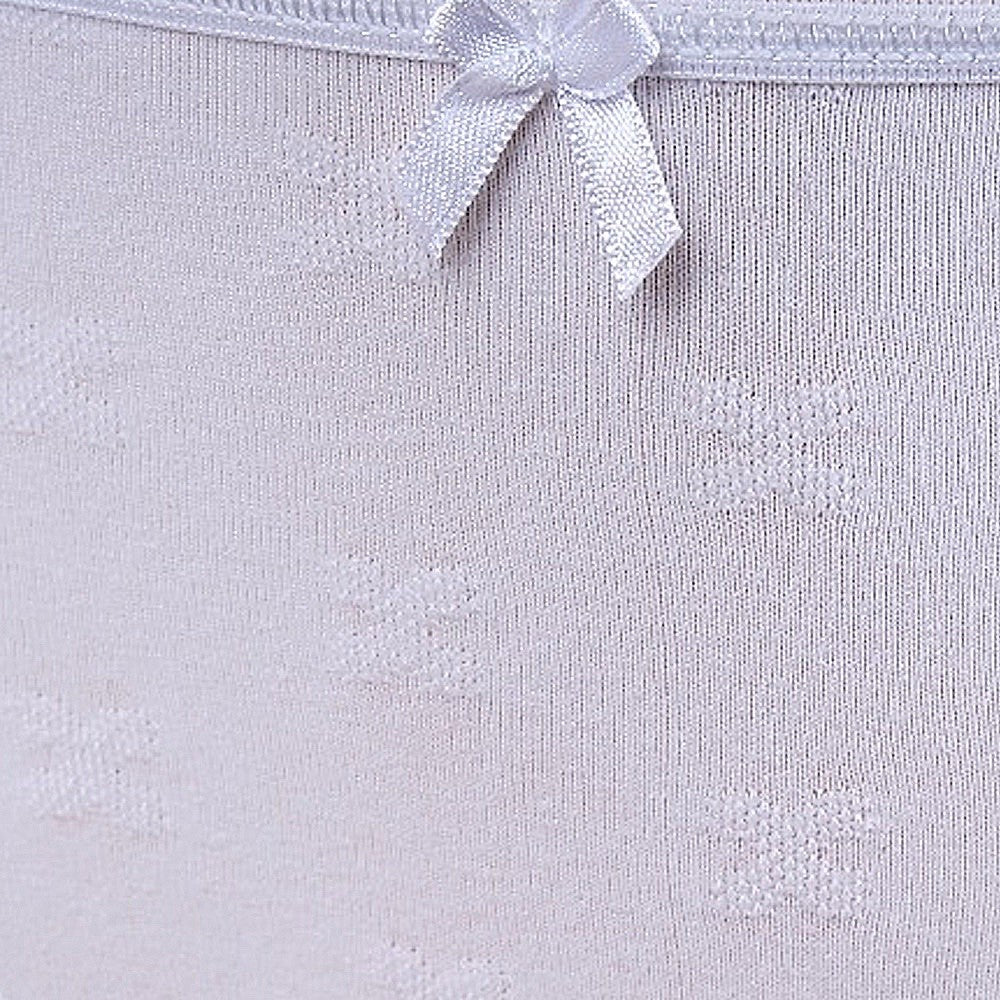 Braguita con alta composición en algodón peinado, altamente transpirable. Su porcentaje en elastano hace que sea una prenda adaptable a todo el cuerpo y que recupere su forma tras todos los lavados. La cintura y las perneras también son adaptables, con una puntilla ligeramente brillante que no pica y no aprieta. También tiene de adorno un aplique en forma de lazo en la cintura y un sutil dibujo en relieve en forma de mariposas. El tejido es liso y anti-pilling, no hace bolas. El tiro es medio-bajo, por lo que no molesta la tripa.