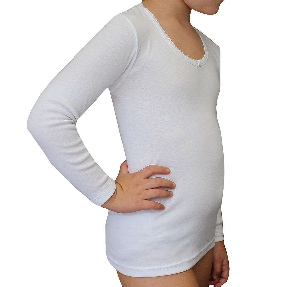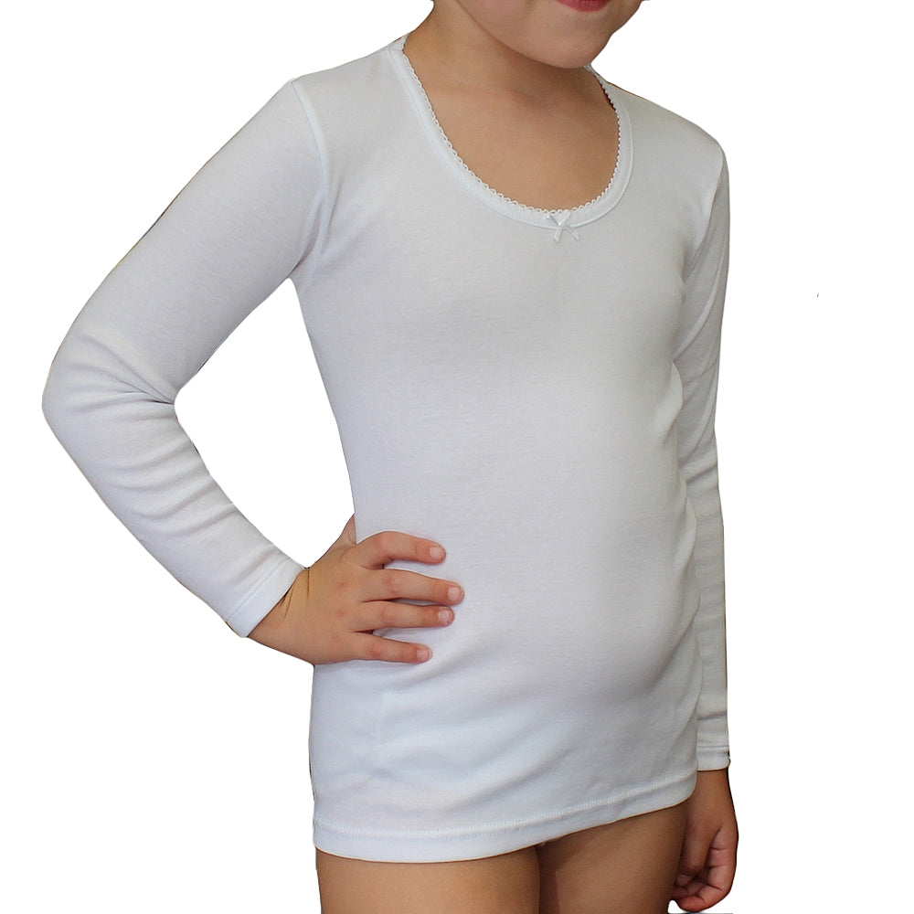 Camiseta interior de manga larga de 100% algodón peinado. Perfecta para las niñas con problemas de piel atópica o problemas en la piel. Gracias a su material 100% natural, es totalmente anti-alérgica, transpirable y no retiene la humedad. La forma del tejido hace que la prenda se adapte al cuerpo sin renunciar a su composición únicamente natural. Tiene una puntilla en el cuello en forma de ondas que no pica, y una flor de adorno en el cuello. Es sin costuras, por lo que no marca por ningún sitio. El tejido es de todo tiempo anti-pilling, que no hace bolas. Combina con nuestra braguita 5520