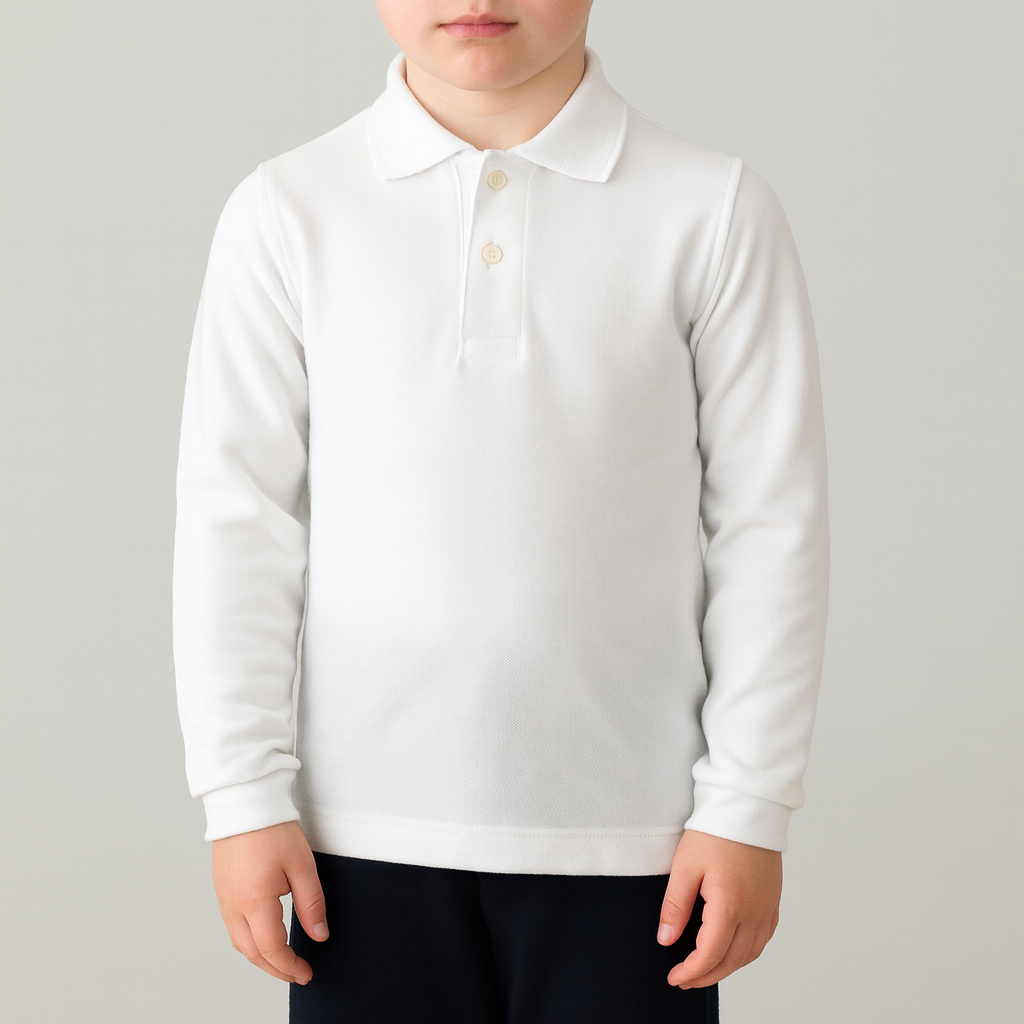 Además, nuestros polos de manga larga para niños vienen en una variedad de colores perfectos para combinar con facilidad: blanco, rojo, crema y celeste.