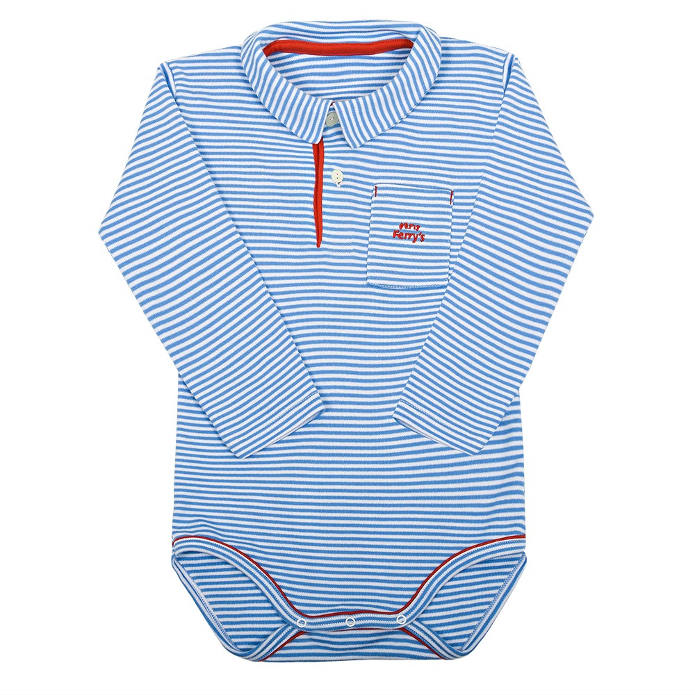 Long-sleeved bodysuit made with winter thermal fabric. The plush 100% combed cotton naps stay in close contact with the skin, keeping your baby warm, safe, and comfortable. It can be worn both indoors and outdoors. It features an embroidered pocket on the chest and a polo-style collar that looks great worn over or without clothing. The striped design features contrasting trim on the neck, chest, and legs. It opens fully at the chest with buttons and at the legs with super-durable snaps. Made of a fully breathable fabric that withstands countless washes.