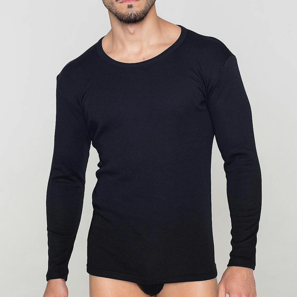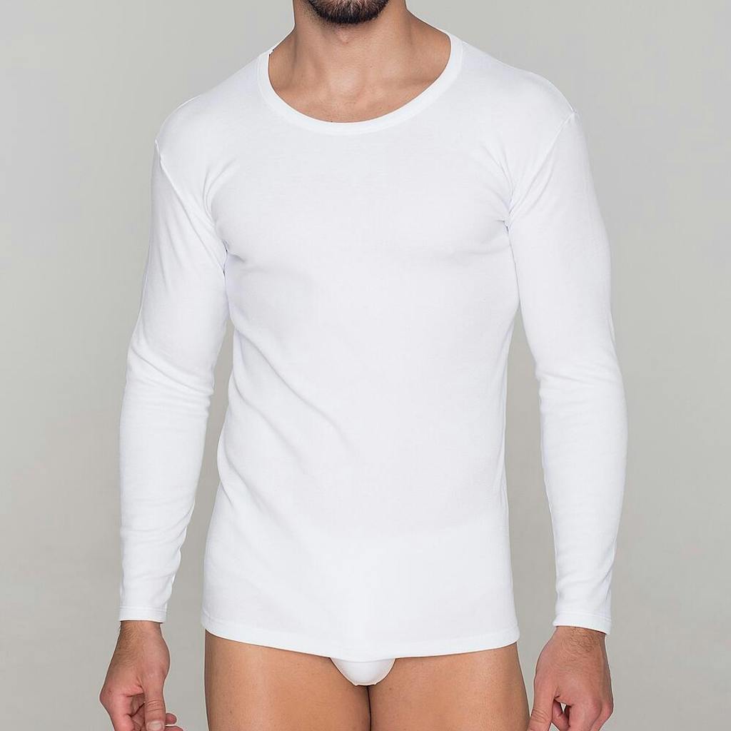 Men's long-sleeved, round-neck undershirt. Made of cotton blend, easy-care, quick-drying, and no-iron.