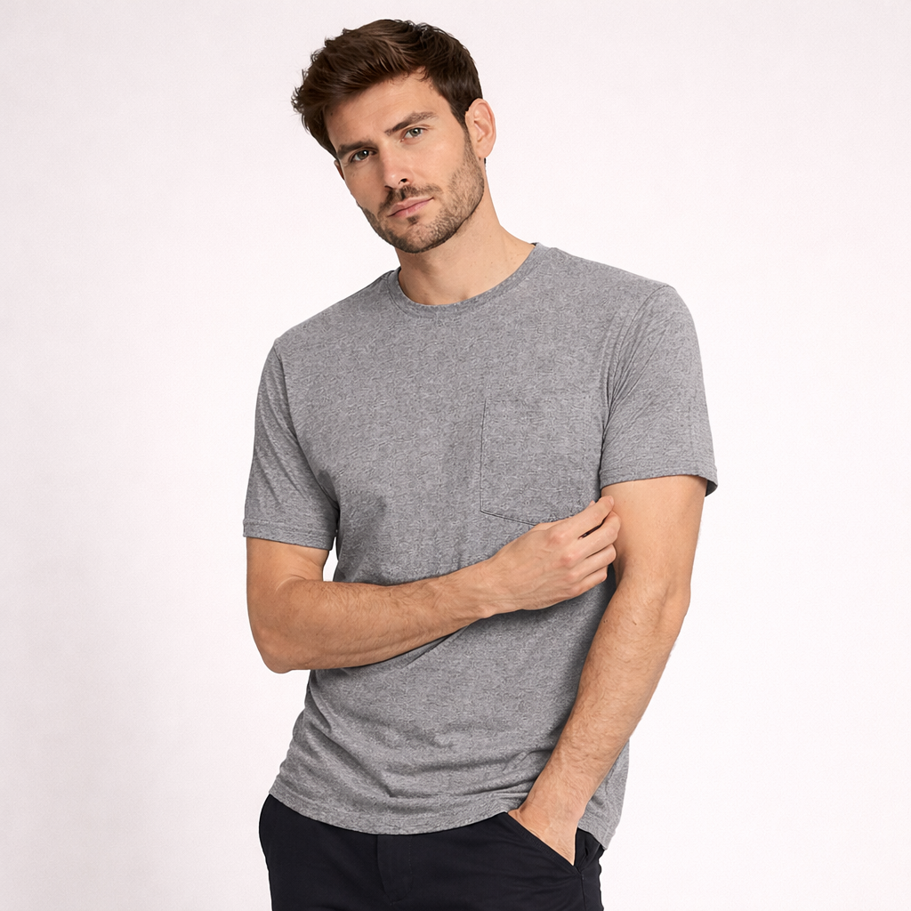 Short-sleeved T-shirt with a chest pocket, made from all-season 100% combed cotton. The collar features a special weave to prevent fraying with wear. This is a completely natural and breathable material, ideal for allergy sufferers or atopic skin. The fabric is anti-pilling, meaning it doesn't pill. The colors won't run with washing.