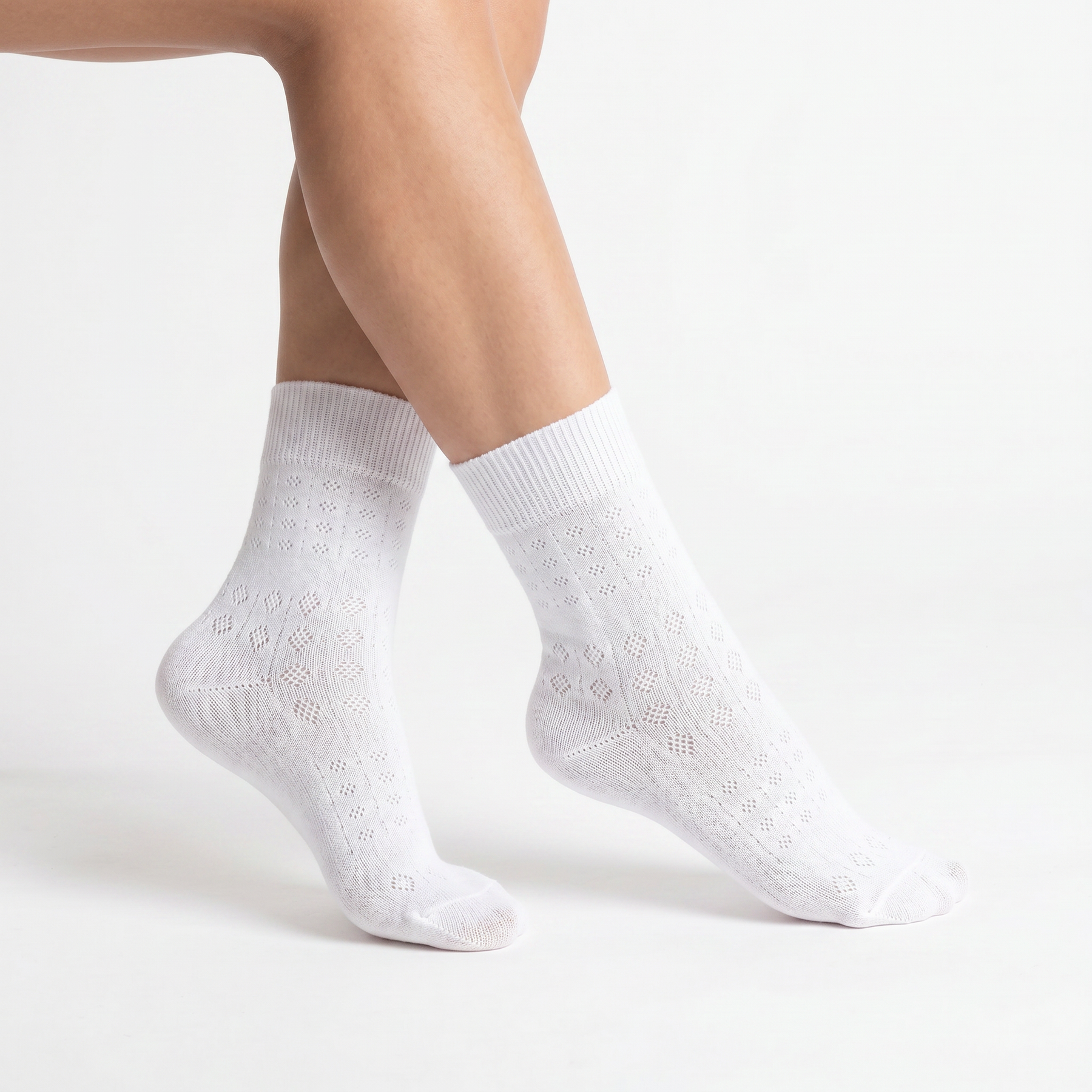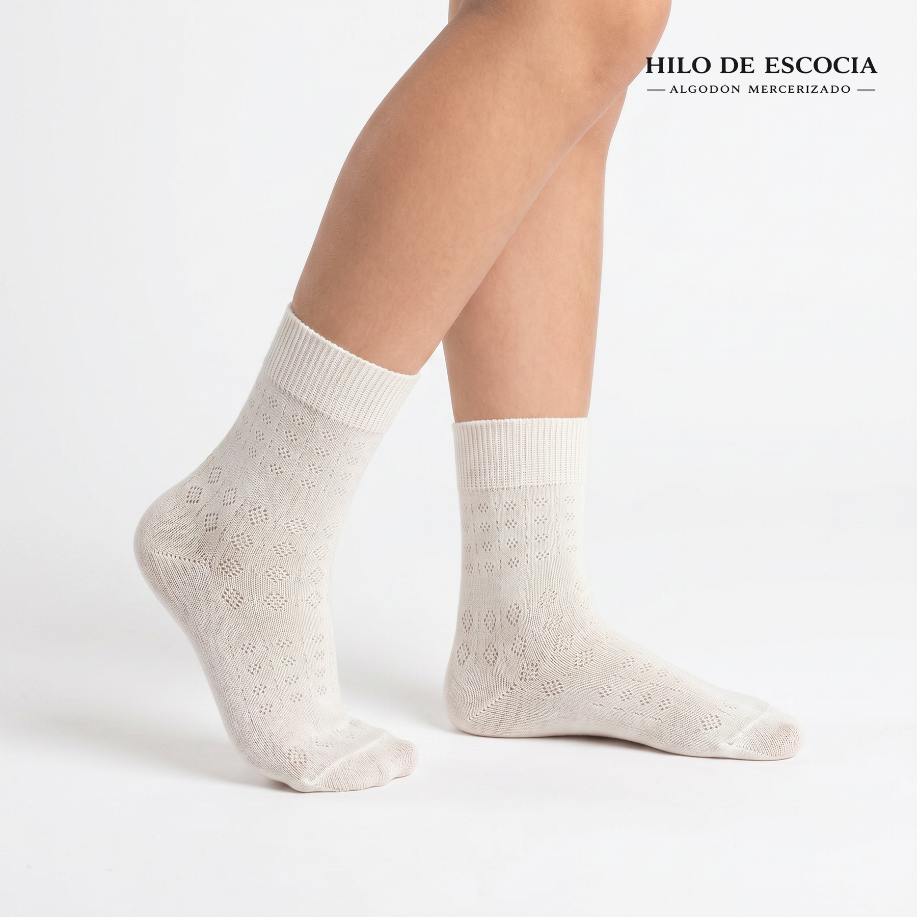 Socks with a high-quality Scottish yarn composition, highly breathable. Featuring an elegant, very fine openwork pattern in the shape of squares and dots, making them perfect for special occasions such as ceremonies or events. They are medium-height, with a wide, non-binding cuff. They pair very well with our children's underwear sets.
