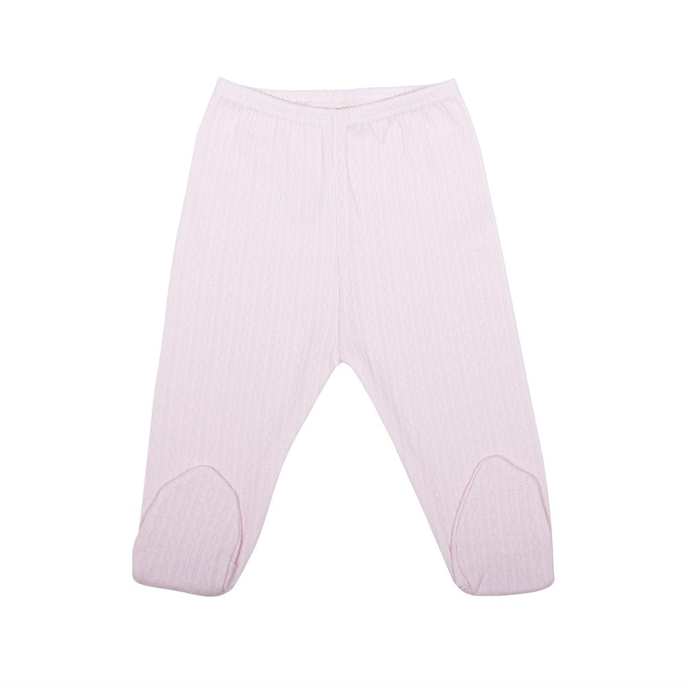 Pants that keep your feet covered without the need for shoes. They're made of 100% combed cotton and an all-season fabric. They also feature a pattern throughout and a non-constricting waistband.