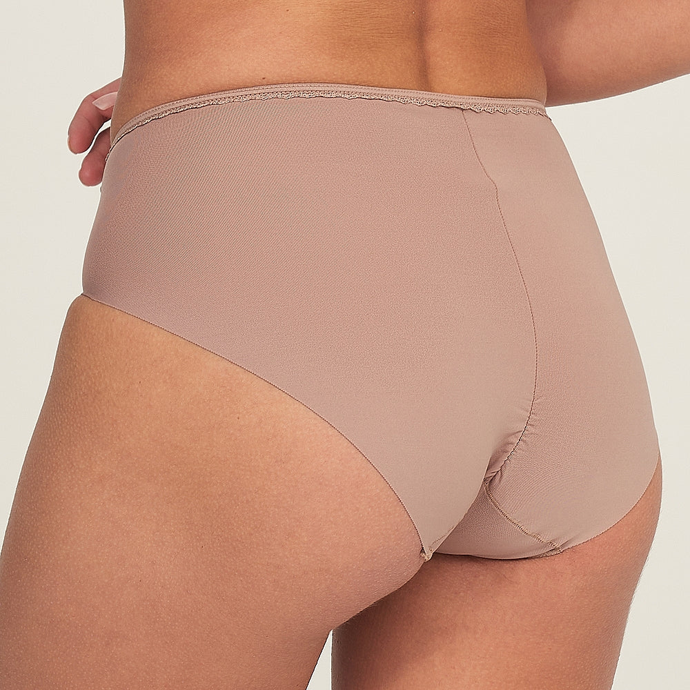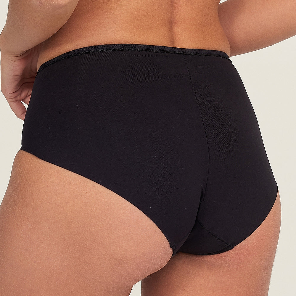 Braguita de talle medio totalmente adaptable y de tejido de todo tiempo. Su parte de atrás hasta mitad pierna está cortada al láser para que no marque nada, incluso hasta en las prendas exteriores más finas. Reforzada con unas puntadas especiales para mantener la braguita en su sitio y que no se desboque. Además, tiene un tejido de rizo en la zona íntima que extrae la humedad para que siempre estés seca. Costuras extra-planas y cintura de adorno que no oprime.Tejido resistente a los lavados y uso. No hace bolas.