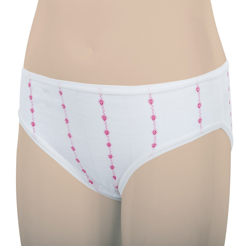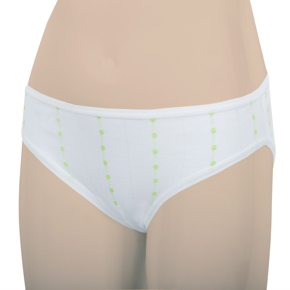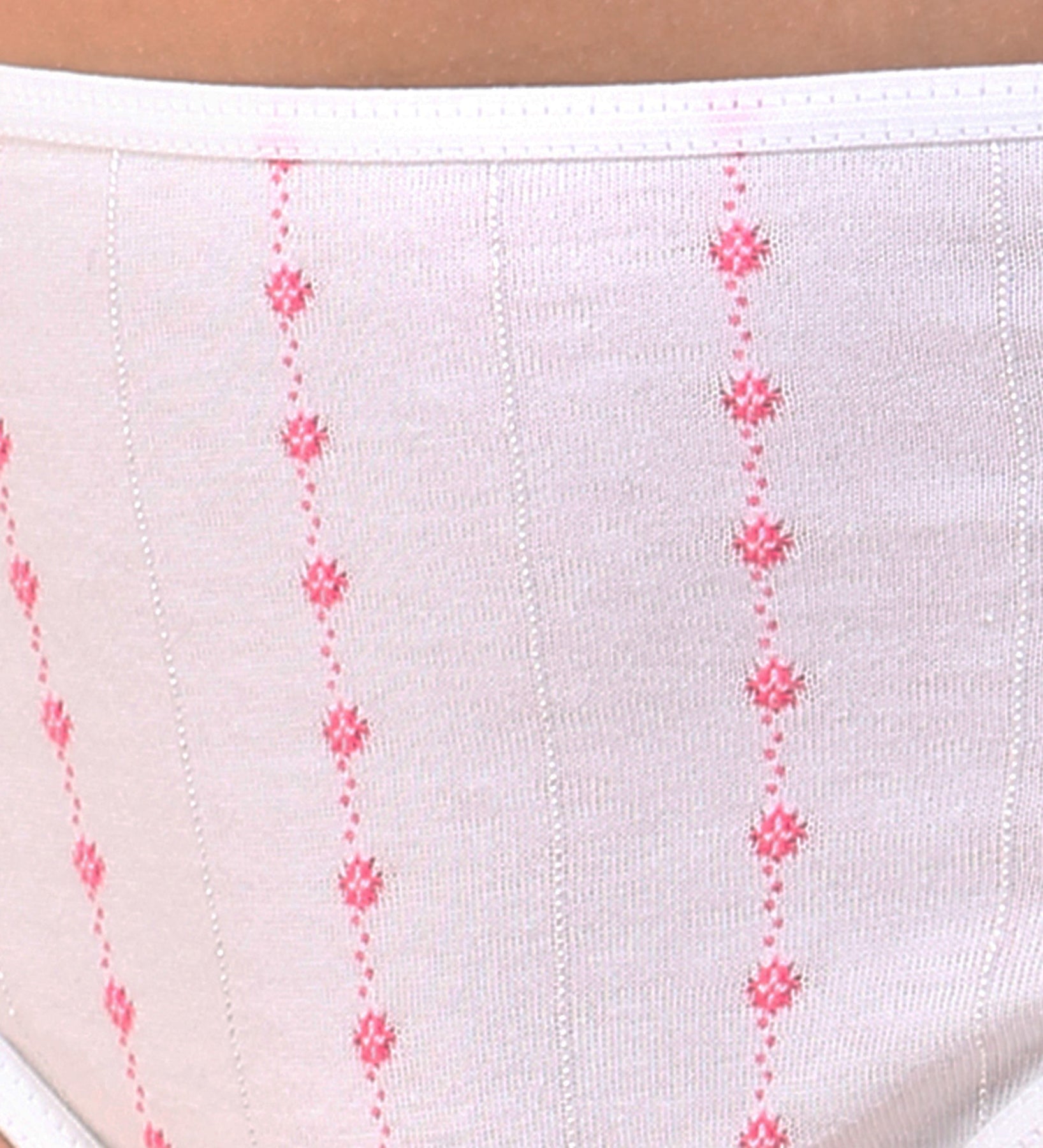 Braguita de 100% algodón peinado con cintura y perneras adaptables. Es de un tejido liso de todo tiempo que transpira y no retiene la humedad. El fondo es blanco con un bordado en forma de líneas y puntos verticales disponibles en varios colores, además de unas líneas muy finas verticales brillantes. Los colores resisten incontables lavados y el tejido es anti-pilling, que no hace bolas. El tiro no es muy alto, por lo que no oprime la cintura.