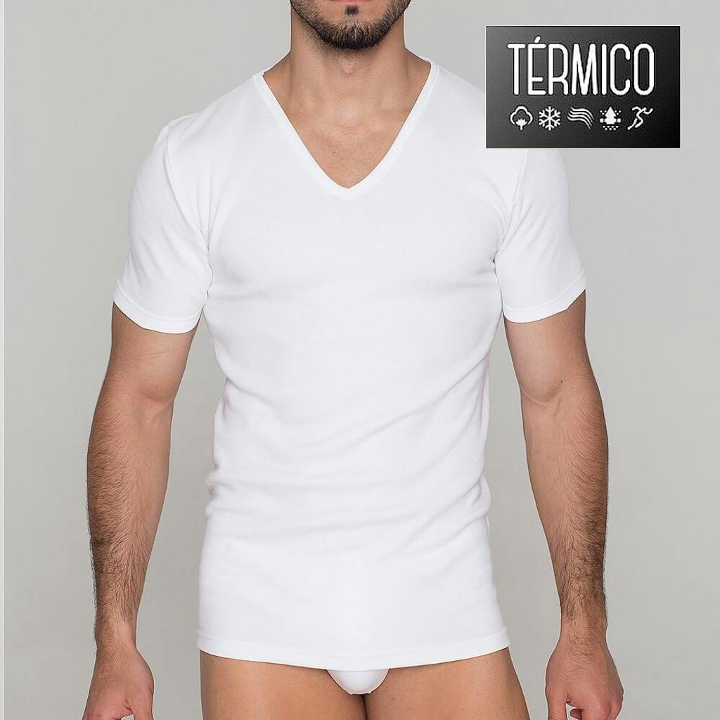 Camiseta interior de manga corta y cuello pico con tejido térmico afelpado de invierno. No se ve debajo de prendas exteriores. Gracias a su composición de 100% algodón peinado, totalmente natural y transpirable, calienta sin retener la humedad, y se aconseja para las personas con problemas de alergia o piel atópica. No tiene costuras, por lo que no roza la piel por ningún sitio y las terminaciones son todas extra-planas y resistentes. Además el cuello está hecho de un tejido especial, que no se desboca con el uso. Tejido anti-pilling, que no hace bolas. Calidad premium.