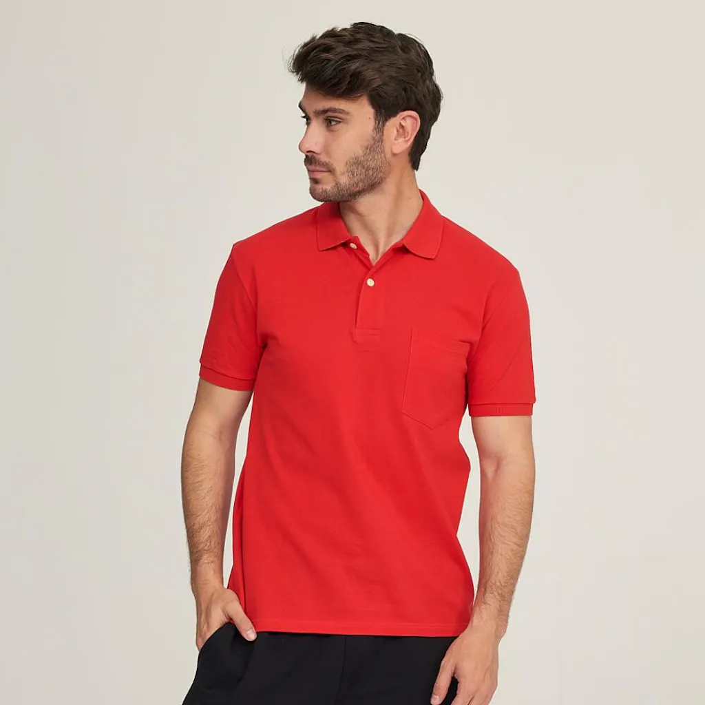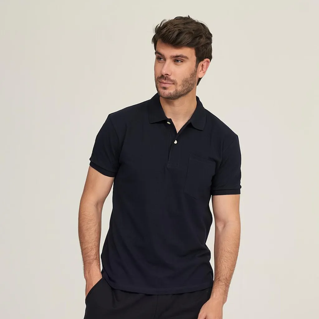 Polo de manga corta de 100% algodón peinado, con tejido de todo tiempo tipo piqué. Tiene puño en las mangas, botones en la tapeta del cuello y bolsillo en el pecho. Con un tejido especial en los puños y cuello para que no se desboque con el uso. El patrón es clásico, no queda ceñido al cuerpo, sino que queda recto. Material totalmente natural y transpirable y tejido anti-pilling, que no hace bolas. Los colores son muy duraderos con los lavados.